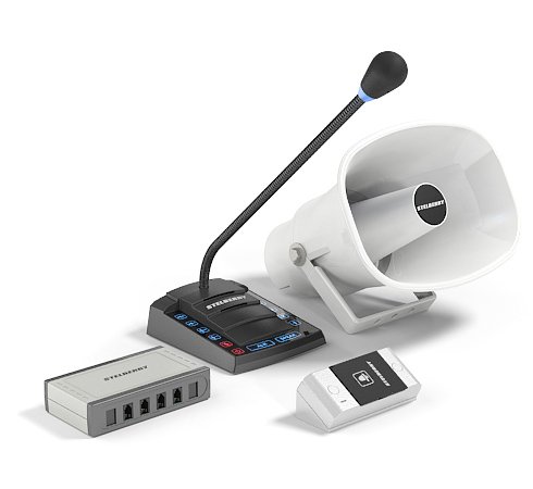 Комплект 4+1-канального переговорного устройства клиент-кассир для АЗС с системой громкого оповещения, функцией "симплекс", функцией "вызов", встроенным усилителем, рупором на 15 Ватт и выходом для записи переговоров. Рупор идёт в комплекте с 15 метрами кабеля. Панель клиента, угловое крепление панели и блоки питания в комплекте.