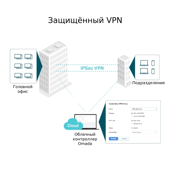 ОСОБЕННОСТИ: интеграция с контроллером Omada SDN, поддержка 100 VPN-туннелей IPsec, 50 VPN-туннелей PPTP/L2TP, 50 туннелей OpenVPN, до 150 тысяч одновременных сессий, балансировка нагрузки, резервирование канала, политика межсетевого экрана, статическая маршрутизация, маршрутизация согласно политике, Multi-net DHCP, гостевой портал, VLAN"
